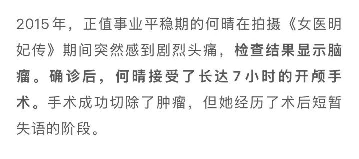 何晴是2015年拍摄拍摄《女医明妃传》期间突然感到剧烈头痛,这才去医院接受了检查。没想到结果显示脑瘤。当时医生给出的方案是做开颅手术,何晴也接受了,手术时间长达7小时,足以可见病情凶险。当时手术非常成功,切除了肿瘤,但她经历了术后短暂失语的阶段。