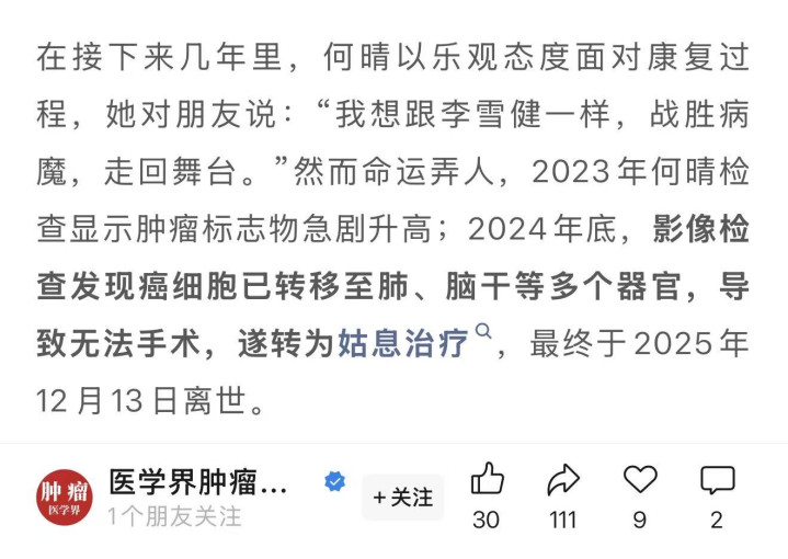 业内人士曝何晴真正死因: 2年前脑癌复发, 1年前癌细胞转到肺脑干